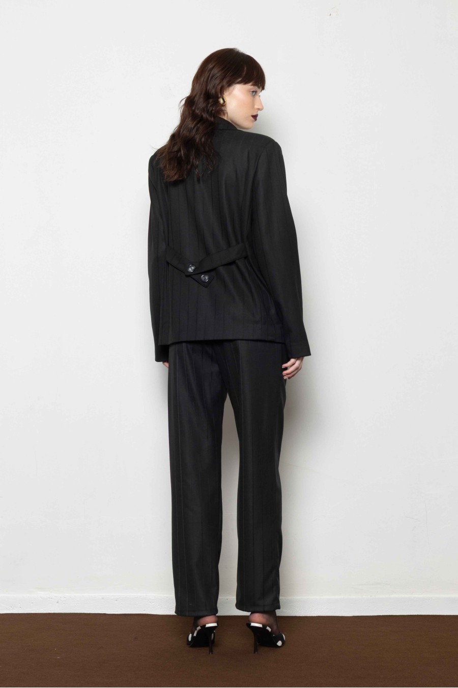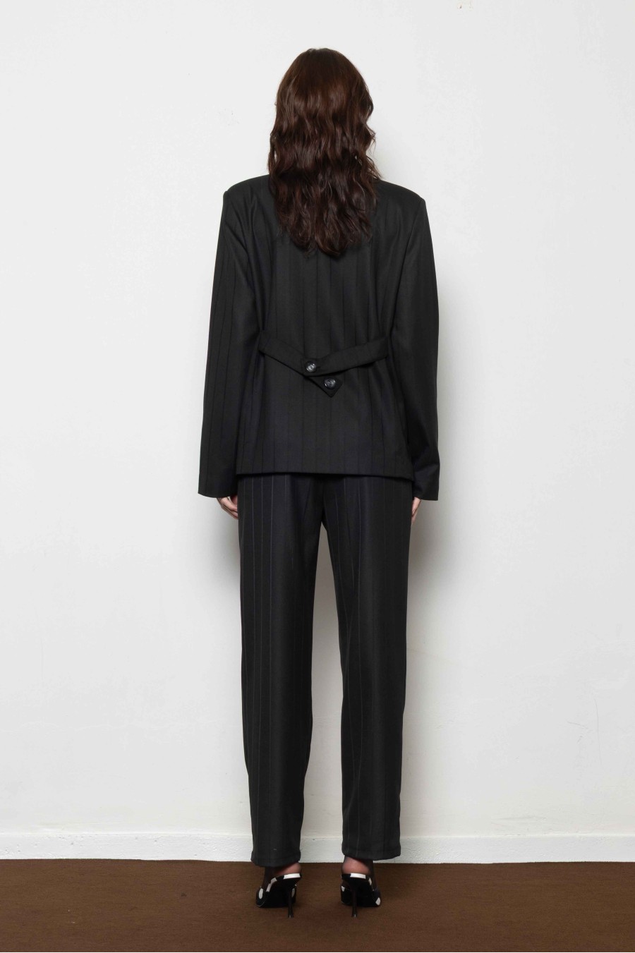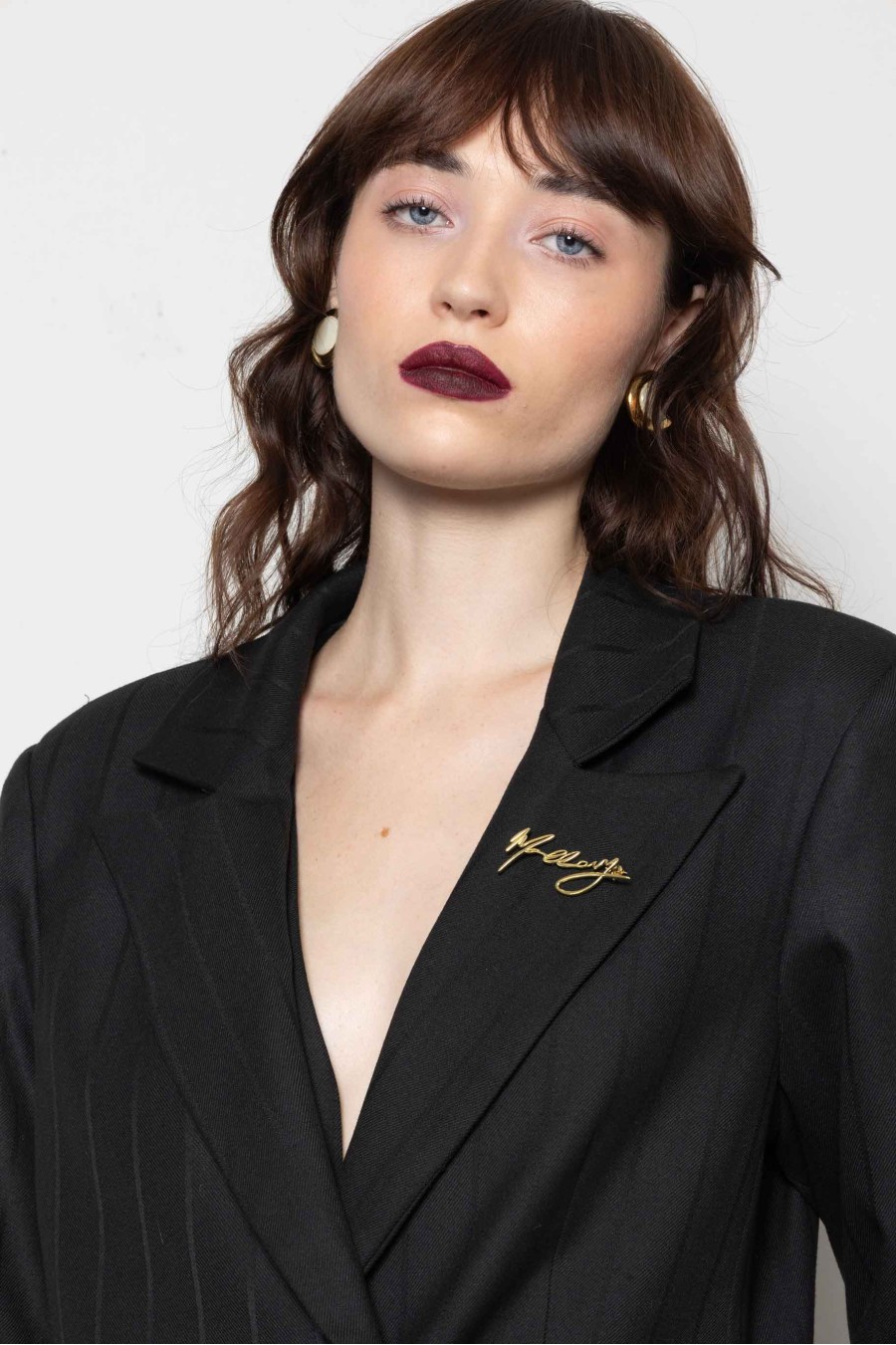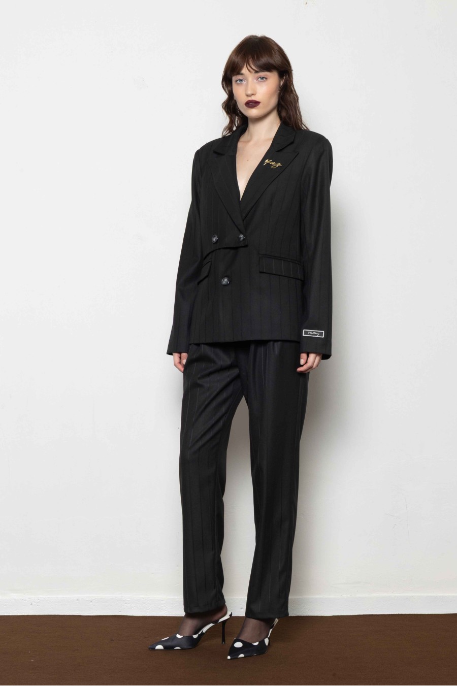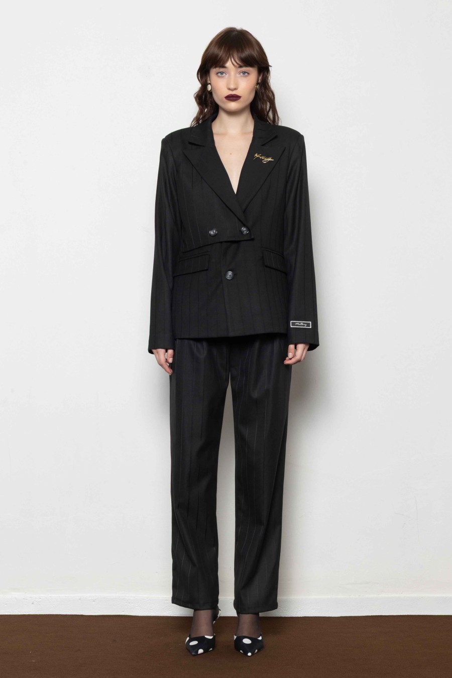 The Mallory the Label Noor Black Blazer features a black-on-black pinstriped with an asymmetric double-breasted closure, oversized padded shoulders, and a discreet logo detail on the sleeve — structured, sharp, and effortlessly cool.
