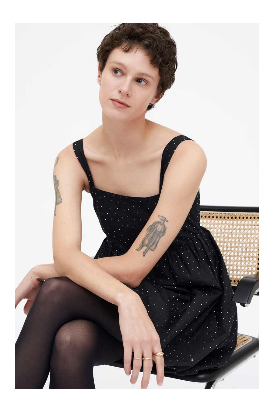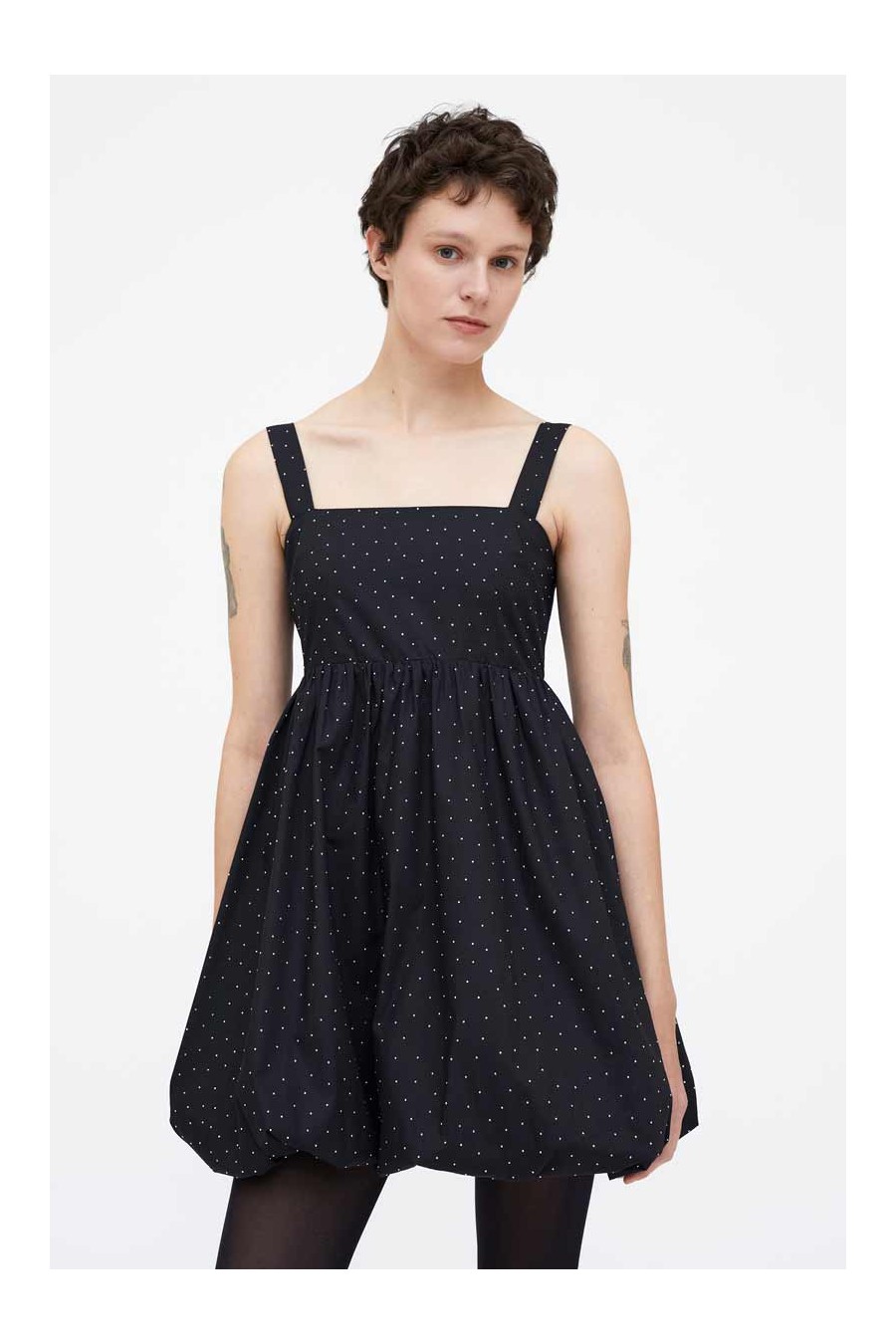 Short black dress crafted from 100% cotton poplin by Wild Pony. Features a square neckline and back, adorned with silver appliqués. The dress has a full, puffy skirt with an inner lining.