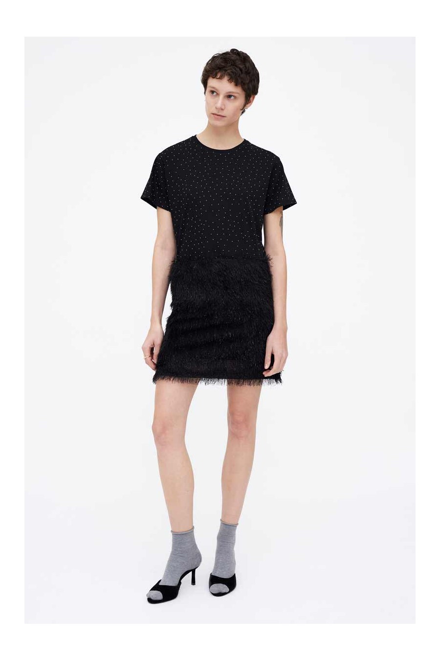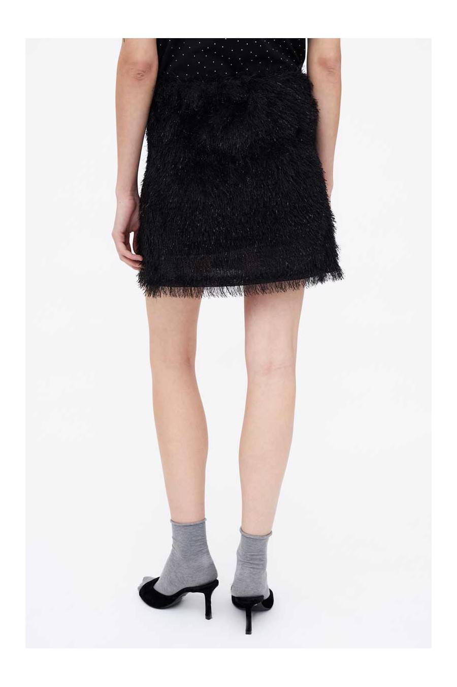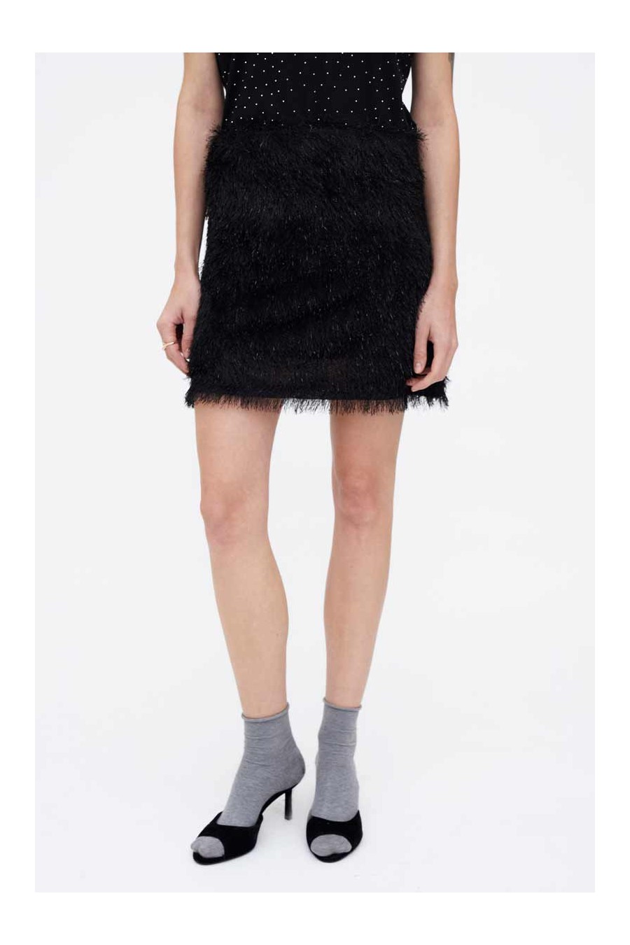 Black mini skirt with lurex threads by Wild Pony. Features a high-rise elastic waistband with an internal elastic band.
