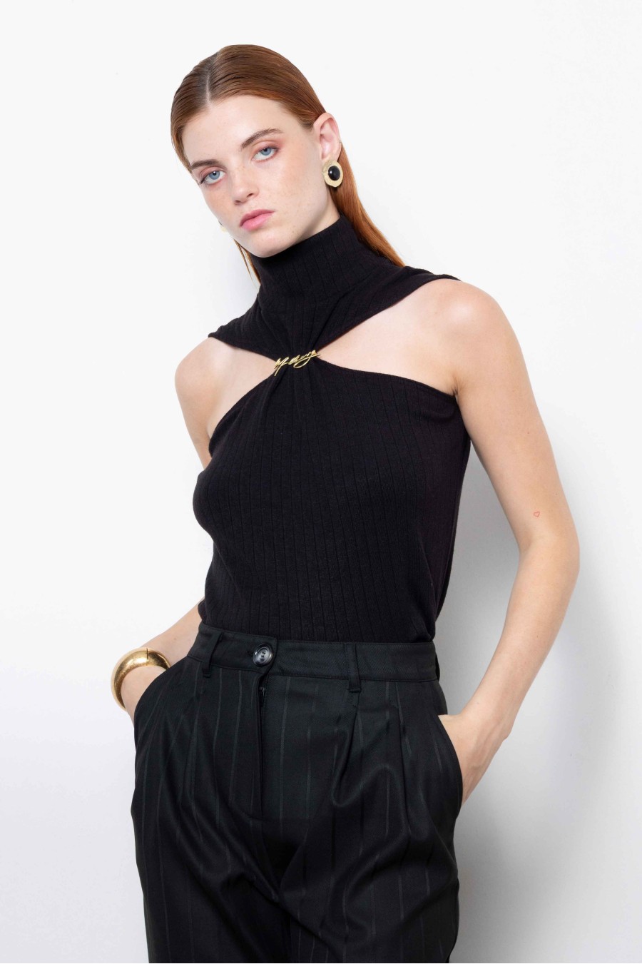 The Whiskey Black Top by Mallory the Label is crafted from super-soft ribbed fabric. This black halter top features a high neckline and a gold MALLORY pin detail — modern, sleek, and effortlessly subtly sexy.